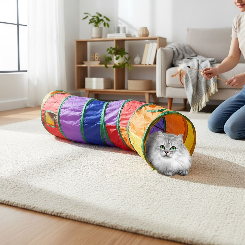 Bu tünel, özellikle evde sıkılan kediler için enerjilerini atma, egzersiz yapma ve zihinsel uyarılma fırsatı sunar. Hem yavru hem de yetişkin kediler için uygundur.